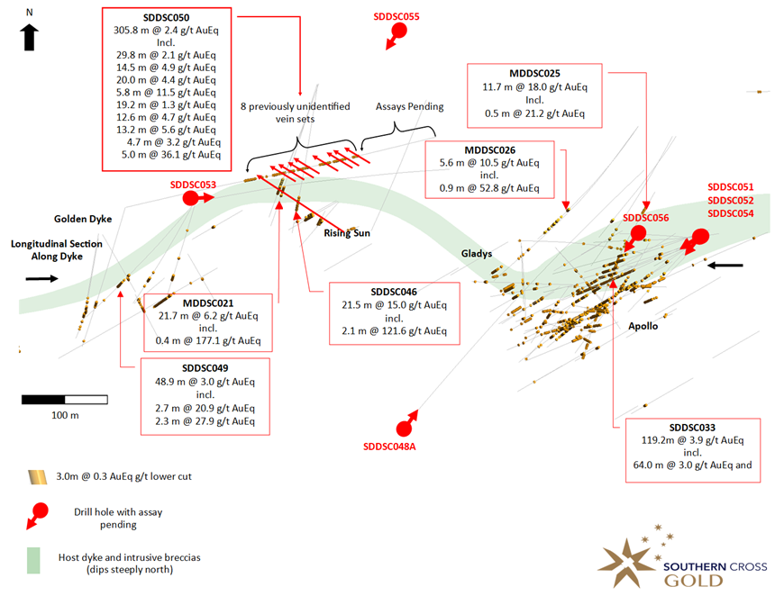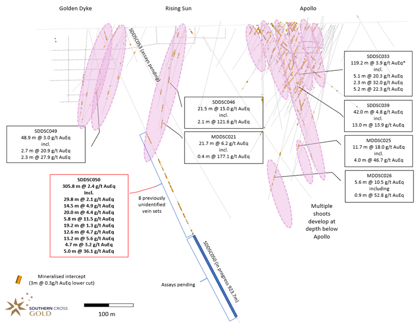 Drill hole SDDSC050, was originally designed to test under the Rising Sun shoot (from 319.2 - 349.0 metres), however the hole continued in mineralization to test a never before drilled area between Rising Sun and Apollo. With only 67% of the hole assayed so far down to 650 m, with drilling continued to 923.7 m SDDSC050 intersected 305.8 m @ 2.4 g/t AuEq (1.6 g/t Au, 0.5% Sb) from 319.2 m (no lower cut). The drill hole to date has also intersected 12 high-grade intersections >20 g/t Au, including 5 high-grade intersections >100 g/t Au. Multiple visible gold zones were identified through the interval at 412.6 m, 419.2 m, 435.8 m, 444.8 m, 492.8 m, 525.4 m, 570.5 m, 589.0 m, 629.4 m and 629.8 m (Photos 1-4). Additionally, visible gold is observed below the assayed intervals reported here at 713.9 m and 836.0 m. Summary grades are outlined in the highlights section above and Tables 2 and 3.
