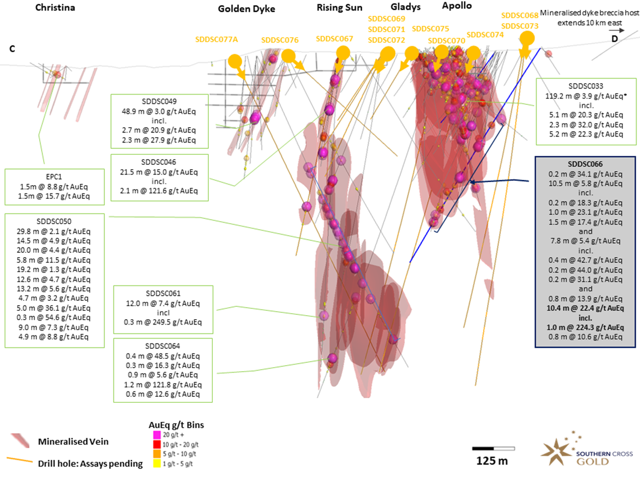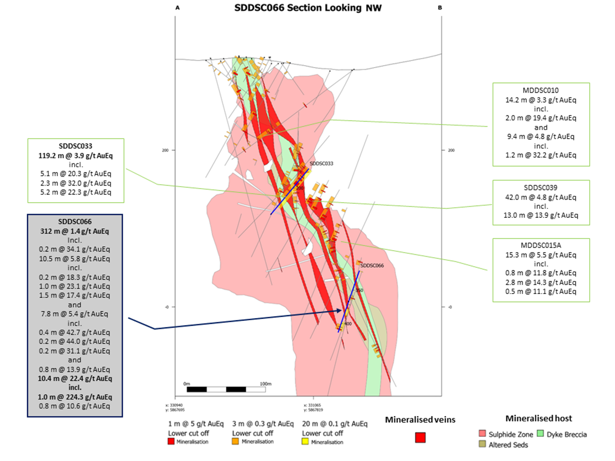 - SDDSC066 (Figs 3-5) drilled from east to west intersected five main mineralized structures over a 312 m wide downhole interval with multiple high-grade intersections: