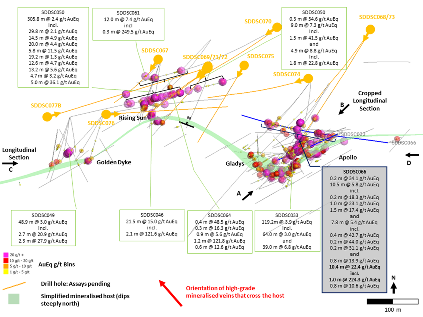 Figure 3: Sunday Creek cropped longitudinal section A-B (50 m influence) across the Apollo area looking towards the northwest showing dyke interpreted mineralized veins sets, SDDSC066 reported here and prior reported drill holes.