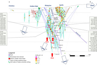 Stereonet data (Figure 1) also demonstrates that gold-antimony ("Au-Sb") mineralization is dominantly hosted within zones of sub-vertical, brittle-ductile NNW-NW striking shear veins and associated veins, containing visible gold, quartz, stibnite, occasional fibrous sulphosalts and minor ferroan carbonates infill. The veins have an associated selvedge of disseminated sulphides in the form of arsenian pyrite, pyrite and arsenopyrite. The mineralized vein sets are typically between 5-30 m wide, 20-100 m in strike (see Figures 5-7 which show 3 individual veins strike distance 30-40 m, 25-40 m, 40-55 m and up to 110 m) and currently defined vertically down to 1 km depth and up to 570 m in depth extent on an individual vein set basis. These zones repeat every 10-20 m within the Apollo and Rising Sun areas with 42 vein sets currently defined to date.