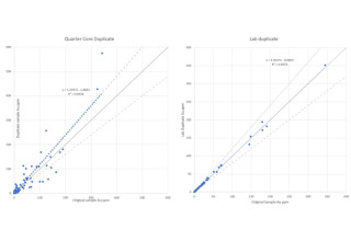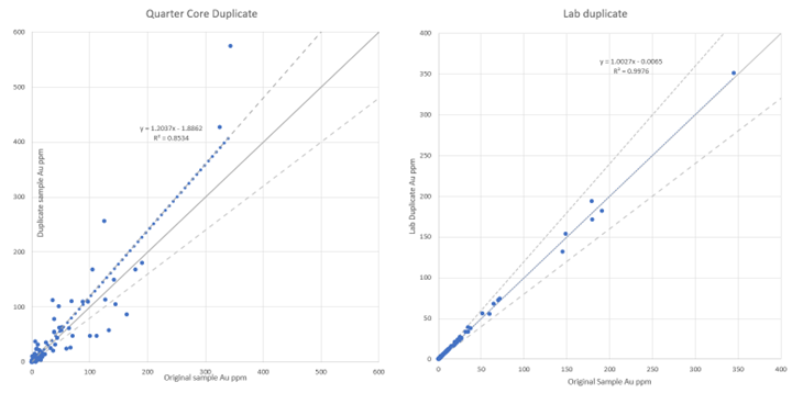 Figure 2: Quality control data showing field duplicates (325 quarter core samples) and laboratory duplicates (2,614 samples from the LM5 pulverizer) show good consistency implying homogenization at both the core and pulp sampling stages with low variability.