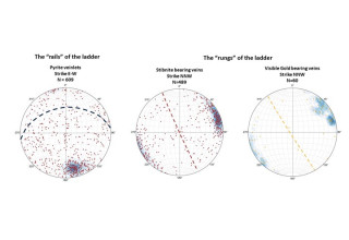 Geological controls on mineralization (structural, chemical, stratigraphic) exist in every ore deposit and Sunday Creek is no different. Mineralization is structurally controlled, with increased mineralization associated within the "bleaching" around and within the intrusive sequence. Early alteration and sulphide (pyrite) mineralization exploited the vesicular/amygdaloidal nature of the pervasively altered/mineralized dyke and the brecciated areas, and forms east-west trending pyrite veinlets. Stereonet data supports this observation and shows pyritic veins parallel the east-west structural host and predates the higher tenor NNW Au-Sb mineralized vein sets (Figure 1).