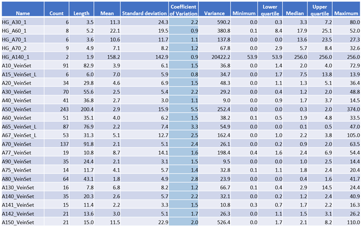 - Continuity of vein sets and grades are described in three dimensions across multiple datasets including: