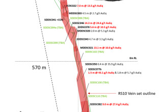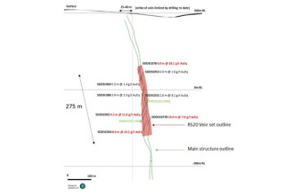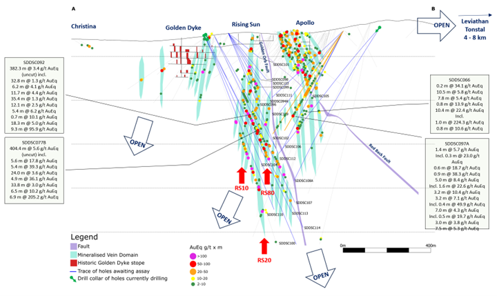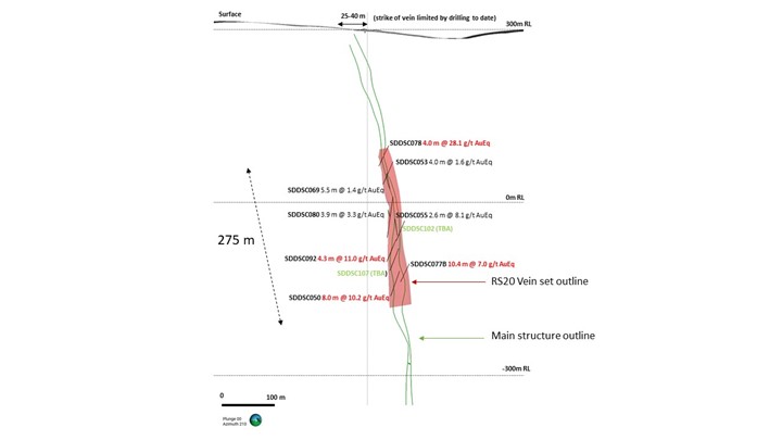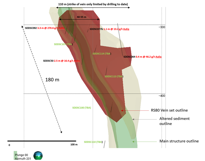 The Company is now able to plan drill holes and predict, with a high degree of confidence, the vertical and lateral extents of high-grade mineralization within the altered "bleached" sediment and dyke host. This is best evidenced at the Rising Sun area where our drilling over the last 6 months has expanded the strike and footprint of these vein sets. Longitudinal section views of vein sets RS10, RS20 and RS80 with mineralized intercepts are shown (Figures 4-7) to demonstrate how the Company is building predictability of veins sets with continued drilling.