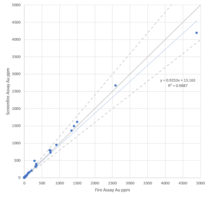 Figure 3: Quality control data showing screen fire assay data (110 samples) compares favourably with fire assay data showing the homogenization of mineralization, and low nugget effect after pulverization.
