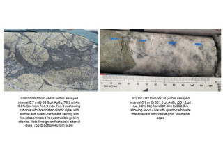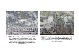 Figure 9: A strong component of the geological domaining of vein sets and high-grade individual veins relies on the geological similarities of the interval; similar mineralogy, vein types and textures are critical to identifying the domain, as well as consistent orientations ensuring that assays are not simply being linked together in a coincident manner. Here examples from drillholes SDDSC077B and SDDSC091.