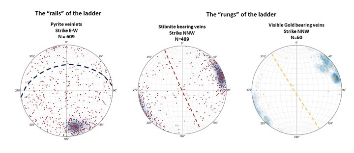 Figure 1: Stereonets showing poles to veins measured in oriented drill core. Stereonet data shows pyritic veins parallels the east-west structural host and predates the higher tenor NNW Au-Sb mineralized vein sets and gold-antimony ("Au-Sb") mineralization is dominantly hosted within zones of sub-vertical, brittle-ductile NW striking shear veins and associated veins.
