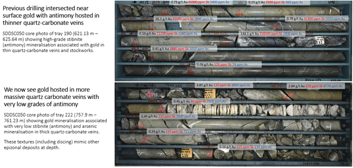 - SDDSC050 is the deepest hole on the project by 278 m. Of note in the lower third of SDDSC050 is the changing nature of mineralization with thick quartz carbonate veins up to 1 m wide with gold and arsenic, but no antimony mineralization. This is a typical change in epizonal deposits in Victoria which transition from gold-antimony to gold only zones at depth (Figure 4).