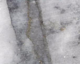 Photo 3: SDDSC050 713.9 m showing visible gold along pyrite and arsenopyrite veinlets within quartz carbonate vein. Field of view 7 mm.