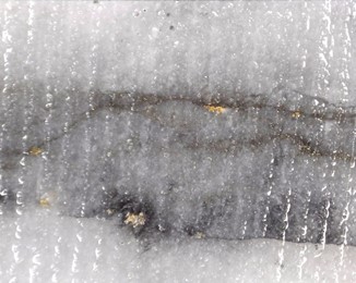 Photo 2: SDDSC050 713.9 m showing visible gold associated with and adjacent to pyrite veinlets within quartz carbonate vein. Field of view 7 mm.