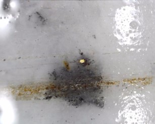 Photo 4: SDDSC050 713.9 m showing fine visible gold associated with arsenopyrite within quartz carbonate vein. Field of view 7 mm.