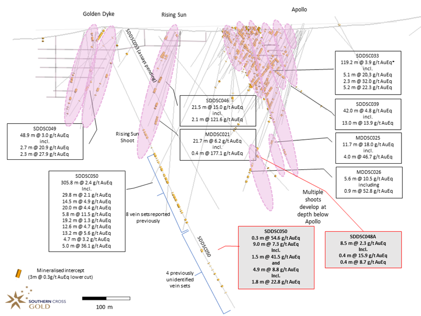 Drill hole SDDSC050 was originally designed by SXG to test under the Rising Sun shoot (from 319.2 - 349.0 m), however the hole continued in mineralization to test a never-before-drilled area between Rising Sun and Apollo. With 100% of the assays returned for hole SDDSC050, it illustrates thick and multiple zones of high-grade mineralization and changes in mineralization style with depth, seen elsewhere in the region. The drill hole also intersected 16 high-grade intersections >20 g/t Au, including 5 high-grade intersections >100 g/t Au. Summary grades are outlined in the highlights section above and in Table 2. SDDSC050 is parallel to the host breccia dyke but at a high angle to the predominant NW high-grade mineralization trend and therefore the true thickness of the mineralized interval is interpreted to be approximately 60-70% of the sampled thickness.