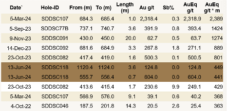 - 0.8 m @ 558.2 g/t AuEq (558.2 g/t Au, 0.0% Sb) from 1,120.4 m, including