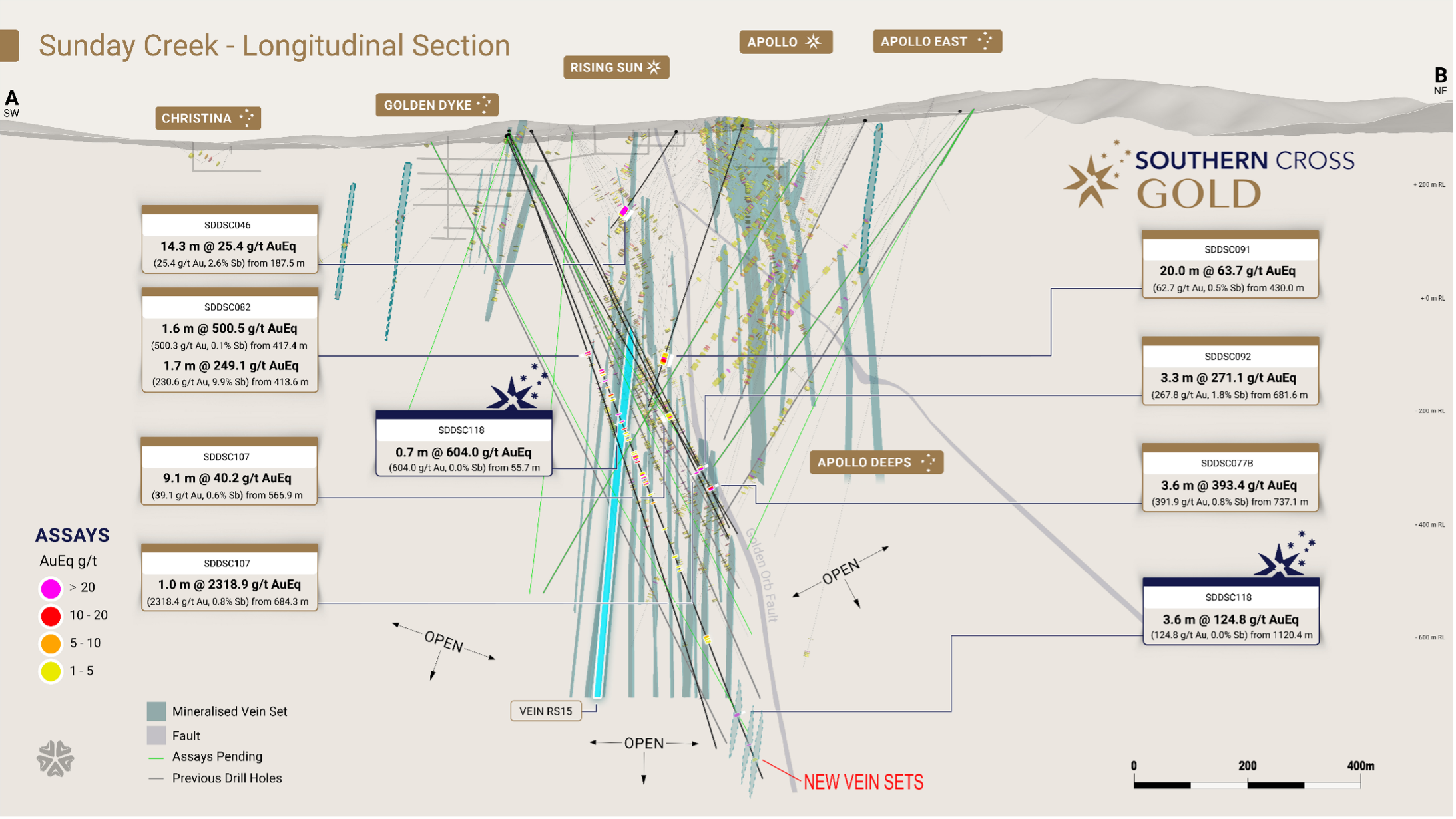 Figure 2: Sunday Creek longitudinal section across A-B in the plane of the dyke breccia/altered sediment host (see Figure 1) looking towards the north (striking 236 degrees) showing mineralised veins sets. Showing SDDSC118 reported here (blue highlighted box) with selected intersections and prior reported drill holes. Three new veins sets identified at depth shown.