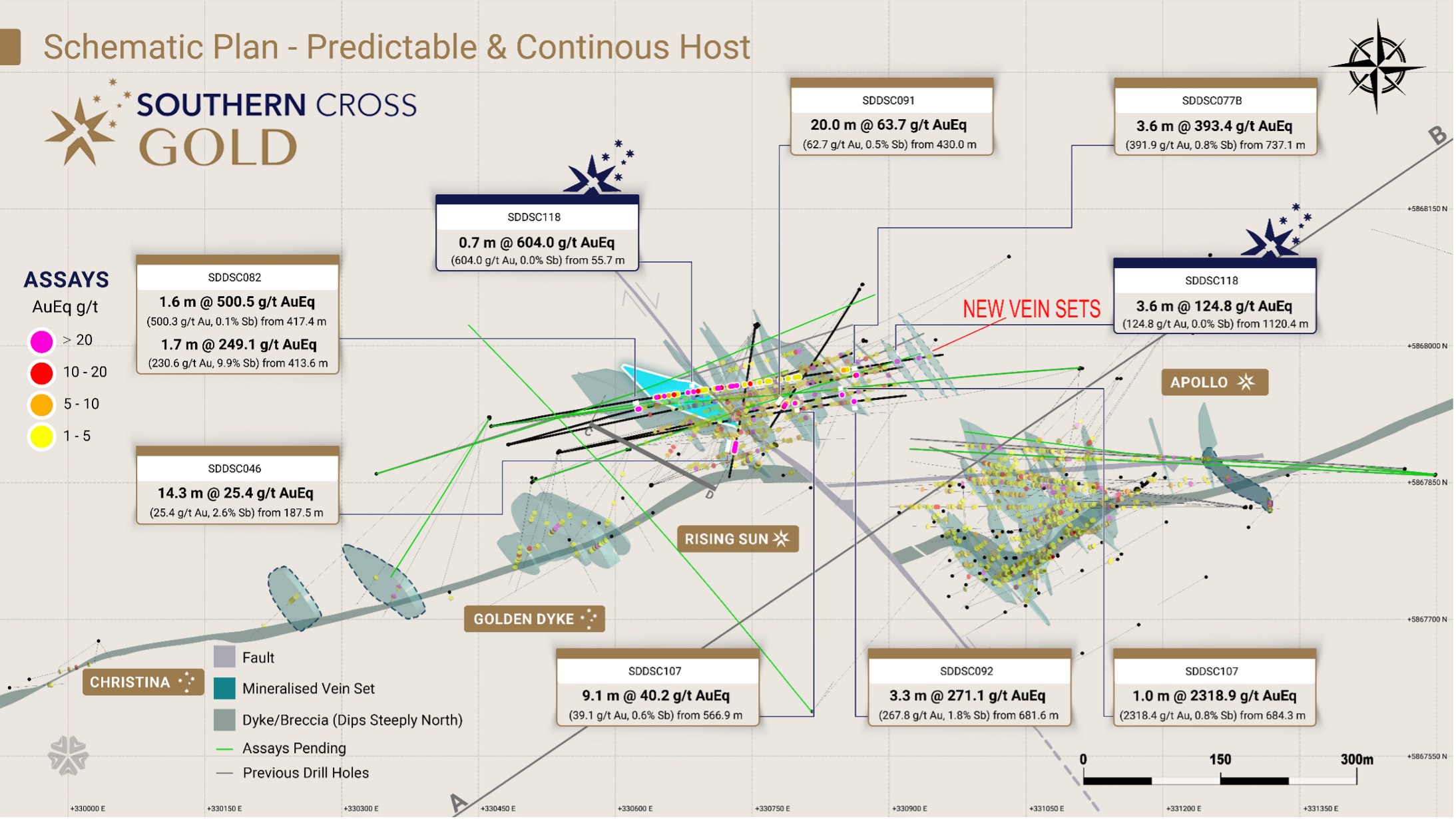 One drill hole (SDDSC118) is reported from the Rising Sun prospect. The hole was designed to test the hanging wall position of one high-grade vein set and drill to depth further east than tested previously. The hole intercepted 11 mineralized structures, eight of which are high-grade.