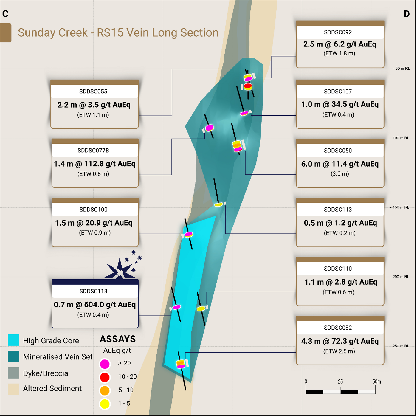 Figure 3: Sunday Creek longitudinal section across C-D in the plane of the modelled vein set RS15, looking towards the north-east. Showing SDDSC118 (blue highlighted box) reported here and prior reported drill holes.