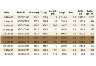 - The hole intercepted 11 high-grade vein sets, including three new vein sets at depth with three additional > 100 g/t AuEq x m intersections and two top 10 results for Sunday Creek (0.7 m @ 604.0 g/t Au and 3.6 m @ 124.8 g/t Au) and included seven assayed intervals of > 50 g/t Au (with three individual assays >900 g/t Au), and four assayed intervals > 2% Sb (up to 19.4% Sb). Drill highlights include: