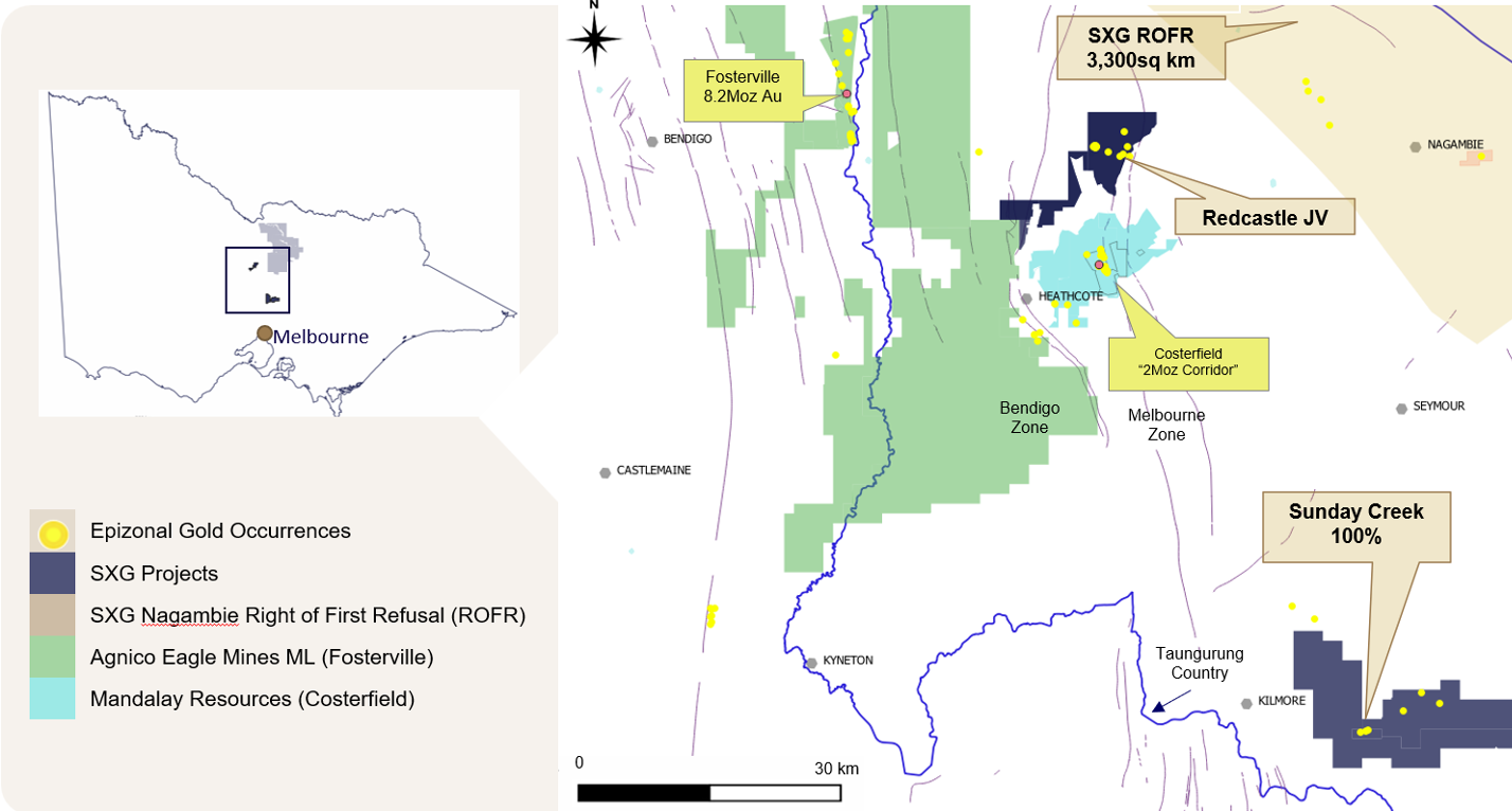 Figure 5: Location of the Sunday Creek project, along with SXG's other Victorian projects and simplified geology.