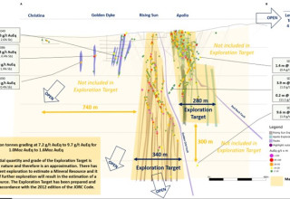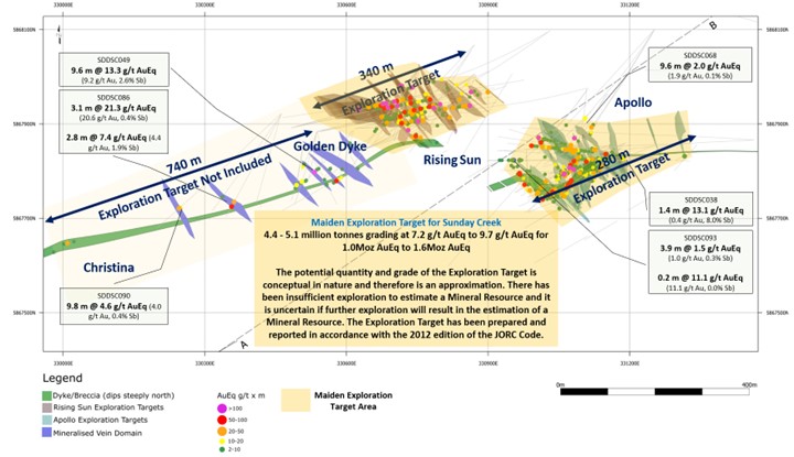 Notably the Exploration Target is constrained to the two main areas along the strike of the dyke breccia host on the project: Rising Sun (over 340 m strike) and Apollo (over 280 m strike) for a total 620 m of strike. This strike represents about 50% strike of the 1.2 km main drill footprint to date at Sunday Creek.