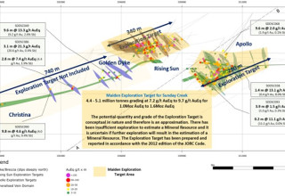 Michael Hudson, Mawson Interim CEO and Executive Chairman, states: "Sunday Creek is a rare high-grade discovery. This Exploration Target is the first early opportunity to demonstrate the scale and high-grade potential as suggested by the last year of successful drilling. Notably, the Exploration Target is constrained to the current drill footprint at Apollo and Rising Sun as they contain sufficient drilling to determine continuity and infer grade ranges. This represents approximately half the strike of the main drill area and significant potential exists to increase the size of the exploration target with high grade drill results drilled for up to 450 m beyond the Exploration Target area. These are early days and we expect further drilling will continue to expand the multi-million-ounce potential and high-grade tenor of Sunday Creek."