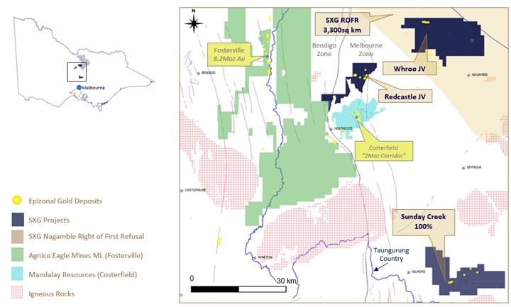 Figure 4: Location of the Sunday Creek project, along with SXG's other Victoria projects and simplified geology.
