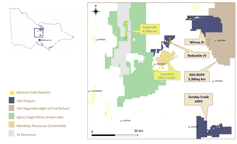 Figure 1: Location of the Sunday Creek project, along with SXG's other Victoria projects.