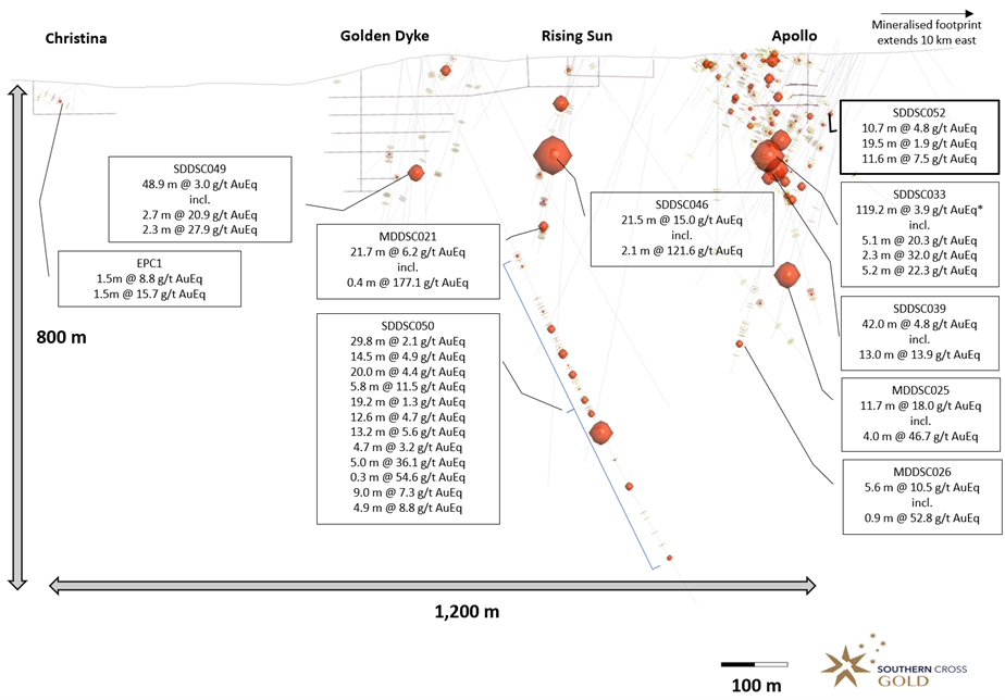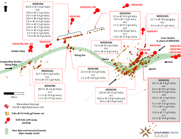 Drill holes SDDSC051 and SDDSC052 were drilled as 40 m step outs to test the most easterly extensions of the project at the Apollo prospect below historic mining areas from the 1880's (Figures 2-4). The holes are located 500 m east of drillhole SDDSC050. SDDSC052 intersected three separate high-grade veins sets (Figure 4). The same three veins sets were also observed in SDDSC051, in this case with anomalous arsenic and low levels of gold, the hole was considered a near miss by SXG. The development of gold bearing zones is restricted to the 50 m to 100 m wide host dyke breccia, with near miss interactions outside of this zone now able to be identified and traced towards higher grades, such as those located in SDDSC052.