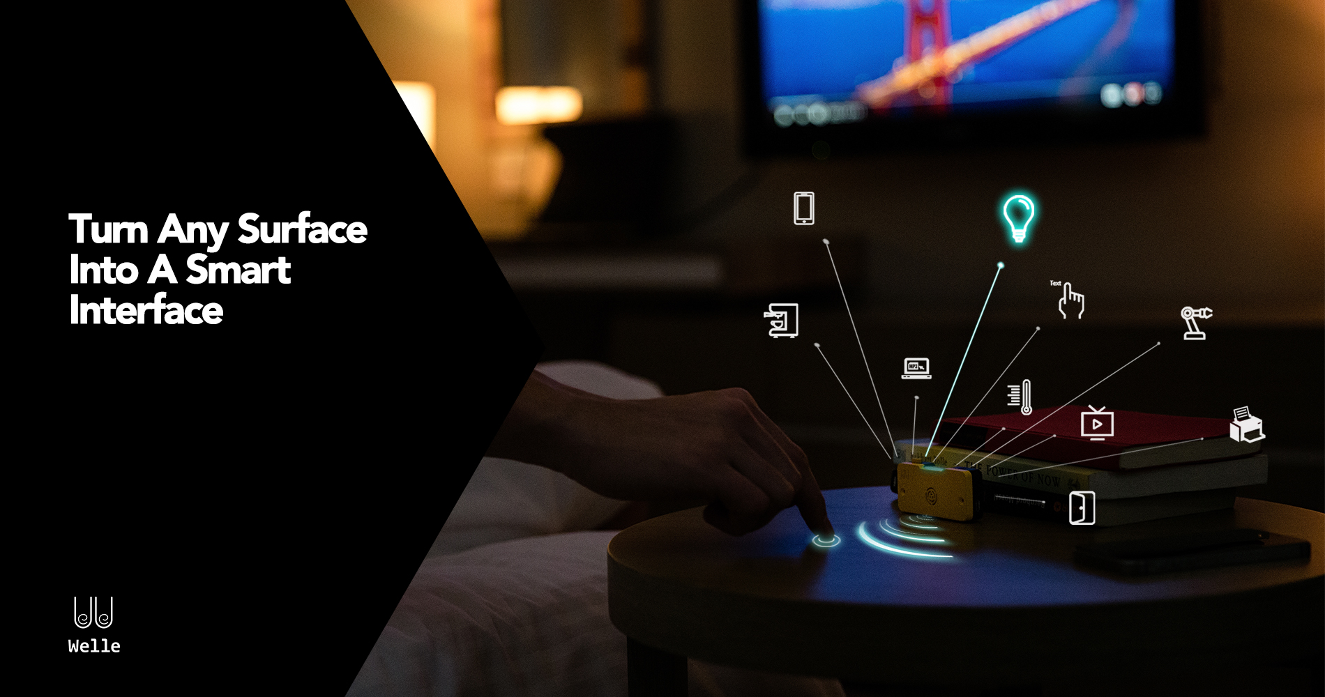 Welle works in the home, office or anywhere with a Bluetooth connection. By placing Welle in a central location hand gestures can be used to control smart devices such as Lights, TVs, Speakers, Door locks, Thermostats, Cams, Curtains, Fans, and more.