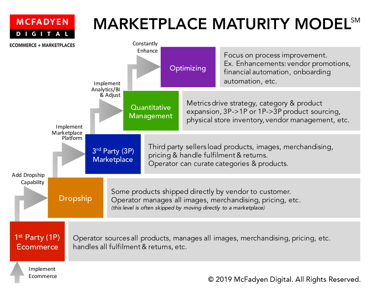The Marketplace Maturity Model makes it much more straightforward to assess the marketplace readiness of an Ecommerce operator or maturity-level of an existing marketplace operator. In the order of marketplace maturity, The 5 steps are; 1st Party (1P) Ecommerce, Dropship, 3rd Party (3P) Marketplace, Quantitatively Managed, and Optimizing. The model provides a framework or map of the “what” a high-performance commerce operator must do to start and grow their marketplace.