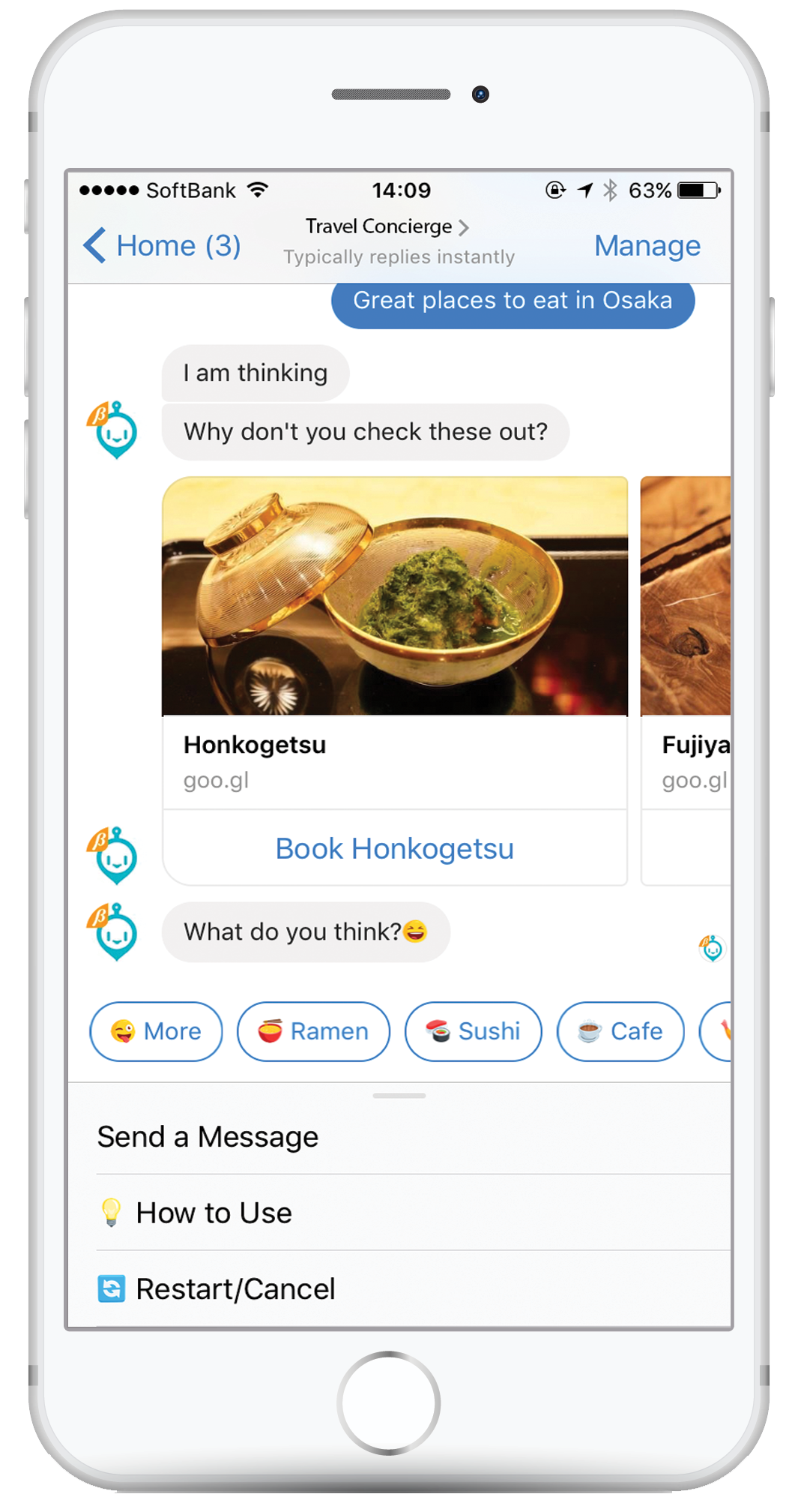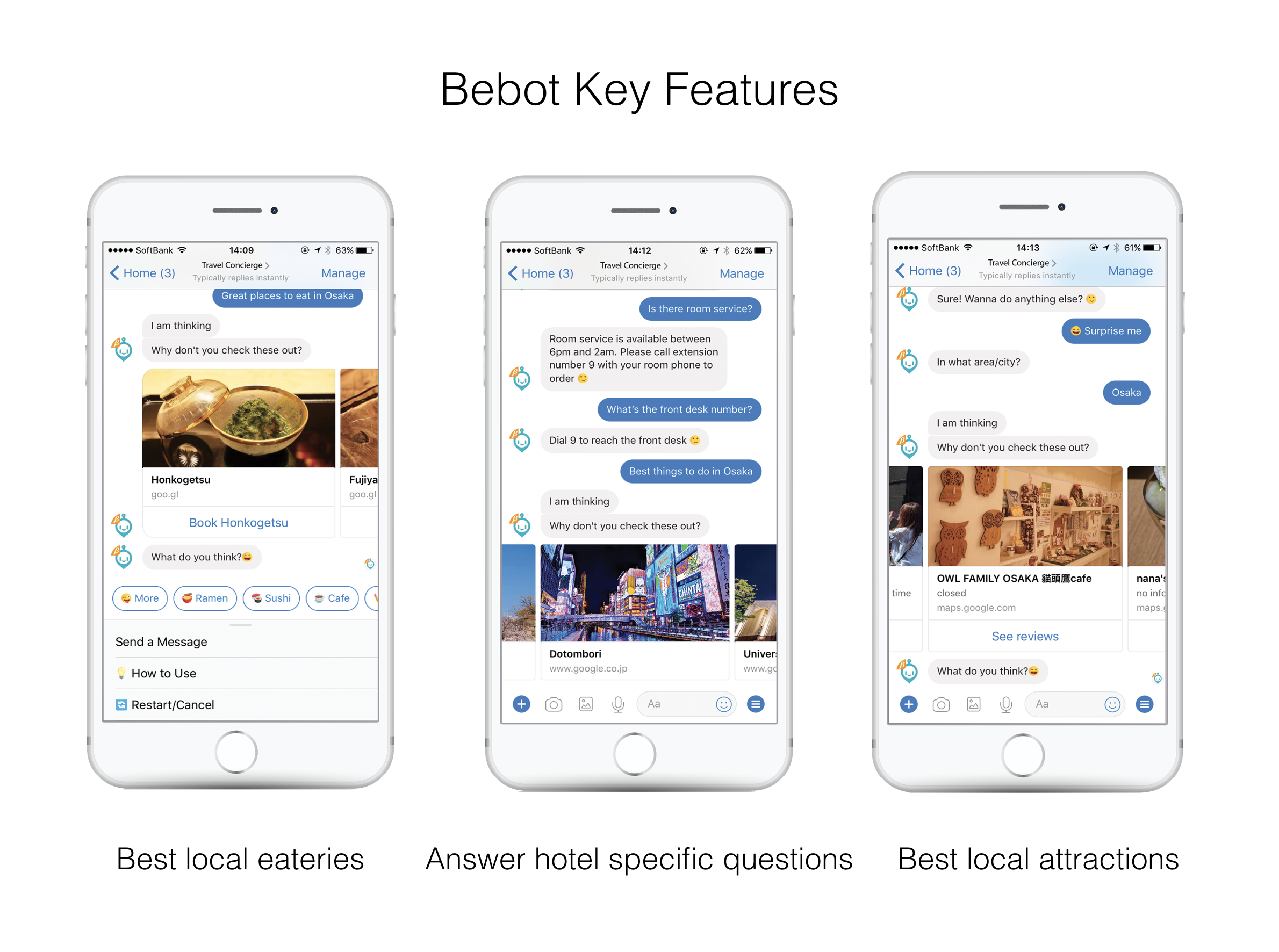 Bebot is an AI-powered chatbot that acts as a hotel concierge. It is designed to empower guests through instant, real-time assistance such as exclusive recommendations for both popular and little-known sights in the area, answering questions only hotel staff would know about, or even making restaurant bookings. Avoiding the stress of language barrier is just one of the benefits. All communication is done on chat application that guests already have on their smartphones, such as Facebook Messenger — there is no need to download an additional app or switch between multiple browser windows to learn one piece of information.