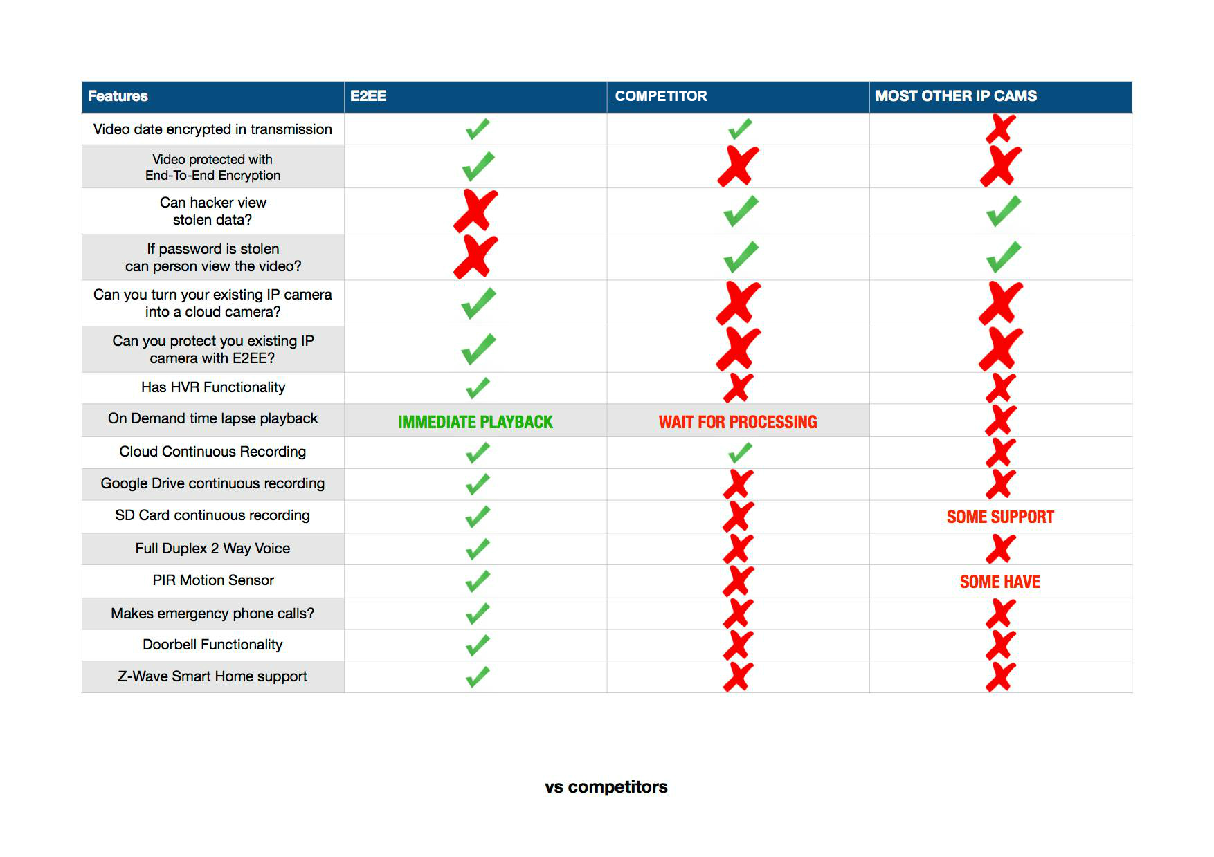The end-to-end encryption (E2EE) camera will encrypt video streams in the camera and then decrypt them in the consumer’s mobile phone. Even if the streams were to be intercepted by a third party, they would be encrypted and therefore not viewable.