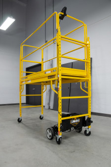 Equipped with a powerful electric motor, the Climb-N-Go™ is propelled by the energy of an 18 to 21-volt battery from one of the six largest battery brands in the industry. Its wheels are installed and locked at the bottom of the scaffold and the joystick control is placed on the guardrail or directly on the rung of the scaffold.