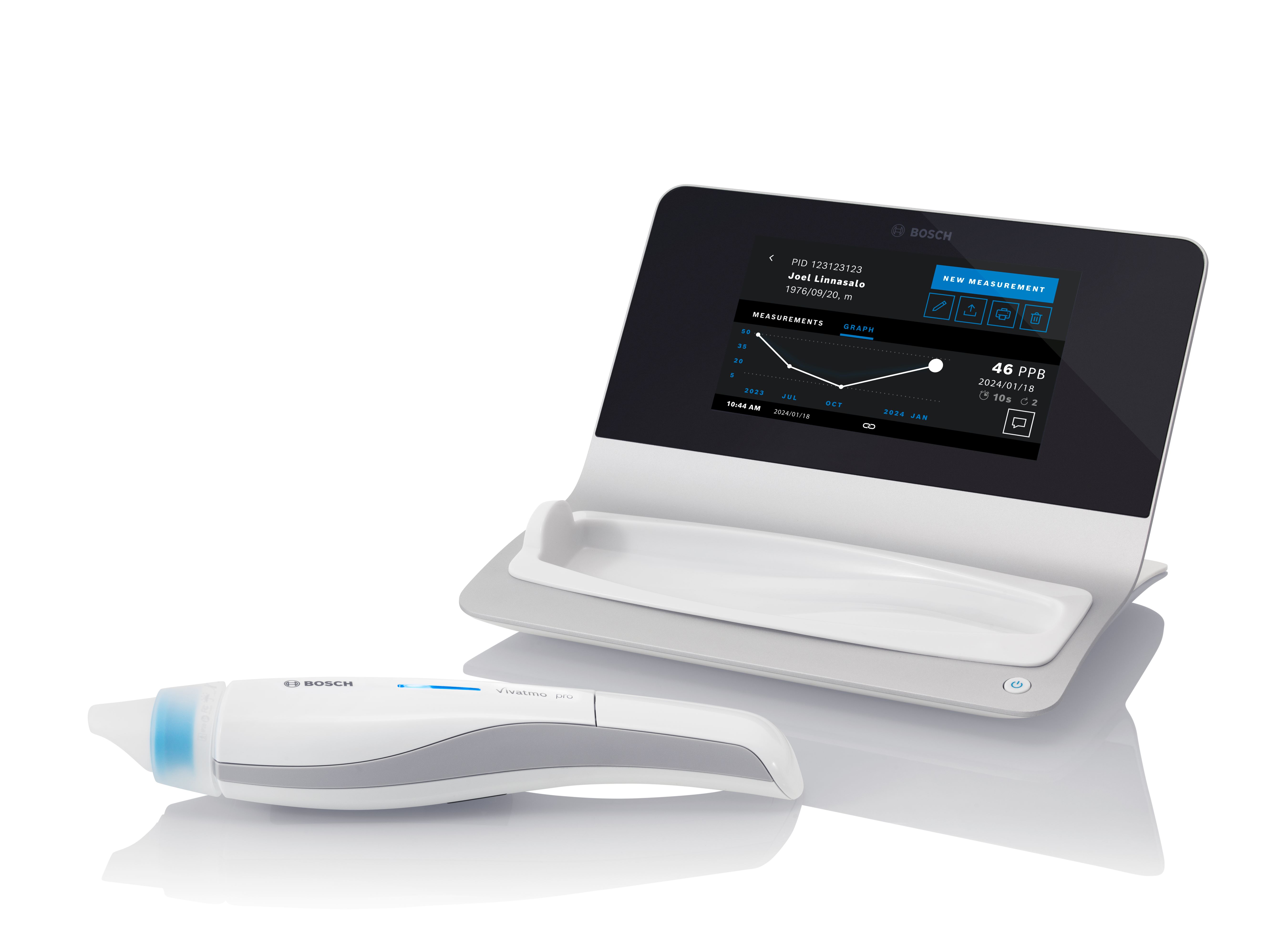 Vivatmo pro is a medical device intended for use by qualified healthcare professionals to perform point-of-care measurements, primarily on asthma patients. Vivatmo pro measures fractional exhaled nitric oxide in human breath (FeNO). FeNO is an increasingly important marker for airway inflammation that is used in asthma management1 to support the diagnoses and individualized therapy. Providing physicians with an enhanced ability to assess airway inflammation can help ensure that patients receive the medication and treatment they need 2. The design award-winning Vivatmo pro device is non-invasive, easy to use, and virtually maintenance-free utilizing high-precision Bosch sensor technology.