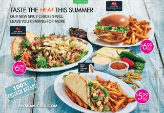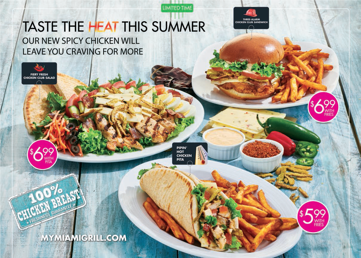 From now until September 27, Miami Grill restaurants nationwide will offer three classics — a Pipin’ Hot Chicken Pita, a Fiery Fresh Chicken Club Salad and a Three Alarm Chicken Club Sandwich.