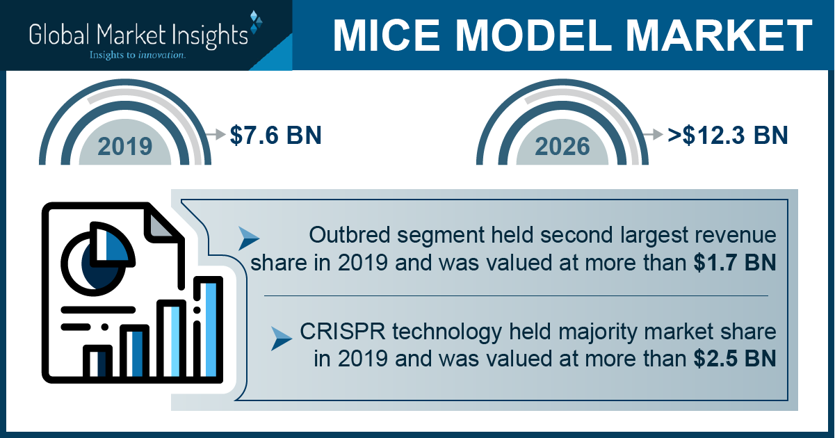 SELBYVILLE, Del., January 4, 2021 (Newswire.com) - According to the latest report “Mice Model Market by Mice Type (Inbred, Outbred, Knockout, Hybrid), Technology (CRISPR, Microinjection, Embryonic Stem Cell Injection, Nuclear Transfer), Application (Research and Development, Production and Quality Control, Academics), Use (Human, Veterinary), End-use (Companies, Organizations, Academic and Research Institutes, Contract Research Organizations (CROs)), Regional Outlook, Price Trends, Competitive Market Share & Forecast 2026”, by Global Market Insights, Inc., the market valuation of mice models will cross $12.3 billion by 2026.