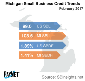 Michigan's PayNet Small Business Lending Index (SBLI) registered at 108.5, outperforming the national SBLI level of 99.0 despite dropping by 0.4% from last month's state level.