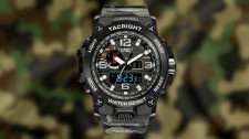 The official product page at mytacticalpromos.com/products/military-watch lists: 50M water resistance, dual time, LED backlight, Japan original digital movement, PU strap with buckle clasp, and strong rubber with hardened glass construction. Additional features referenced in the promotional materials should be verified directly with the company if they are important to your decision.