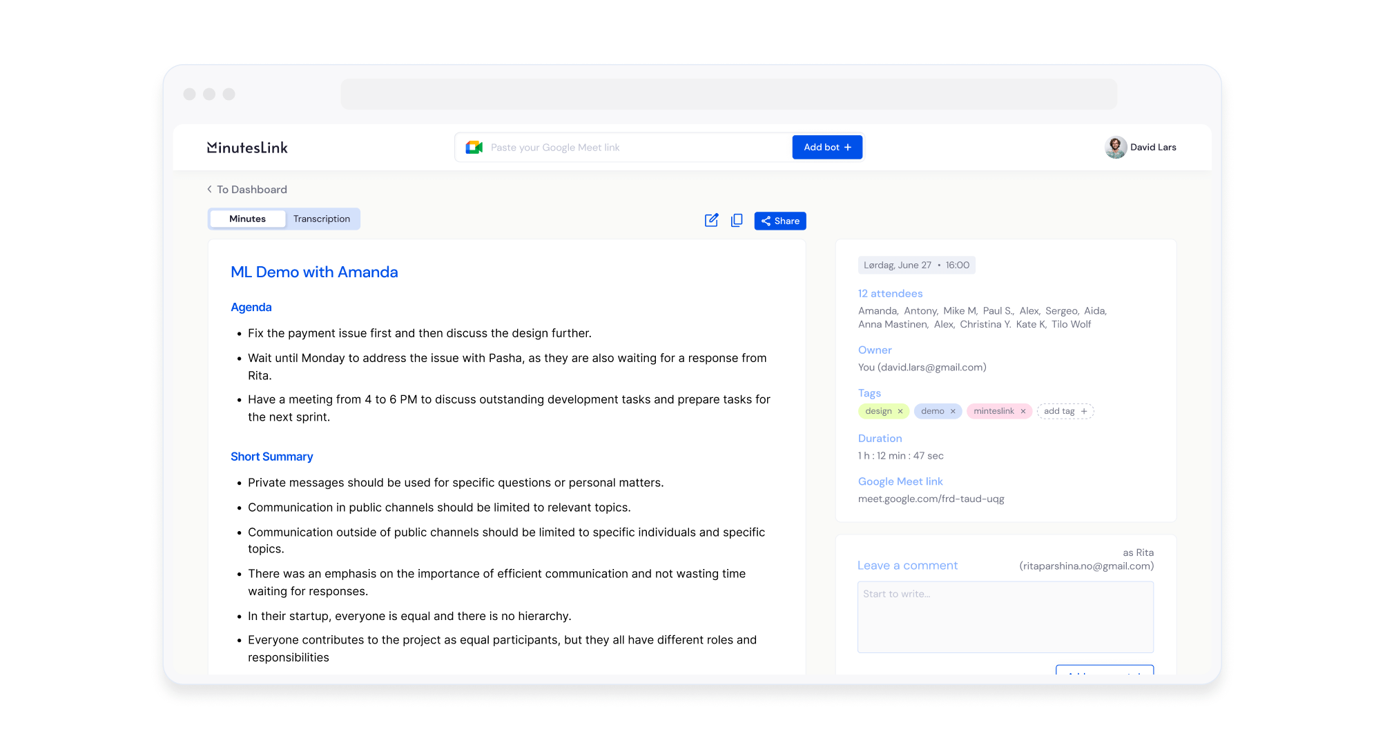 MinutesLink features an intuitive, easy-to-use interface that integrates seamlessly with Google Calendar, requiring just a few clicks to get started. It automatically joins every Google Meet call, recording and transcribing discussions to generate accurate meeting minutes. Even if a professional misses a call, they can effectively be in multiple places at once by using MinutesLink to capture key details. To stay updated on agendas and action items, MinutesLink users can review meeting minutes at any time. This time saving functionality, however, is just a foundation for more advanced technology set to be deployed soon.