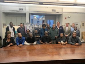 Central Union staff members, along with Andrew Kovalcin of Advanced Advocacy and David Smith from IFA, sit with the recipients of new suits from the Workforce Development and Education Program