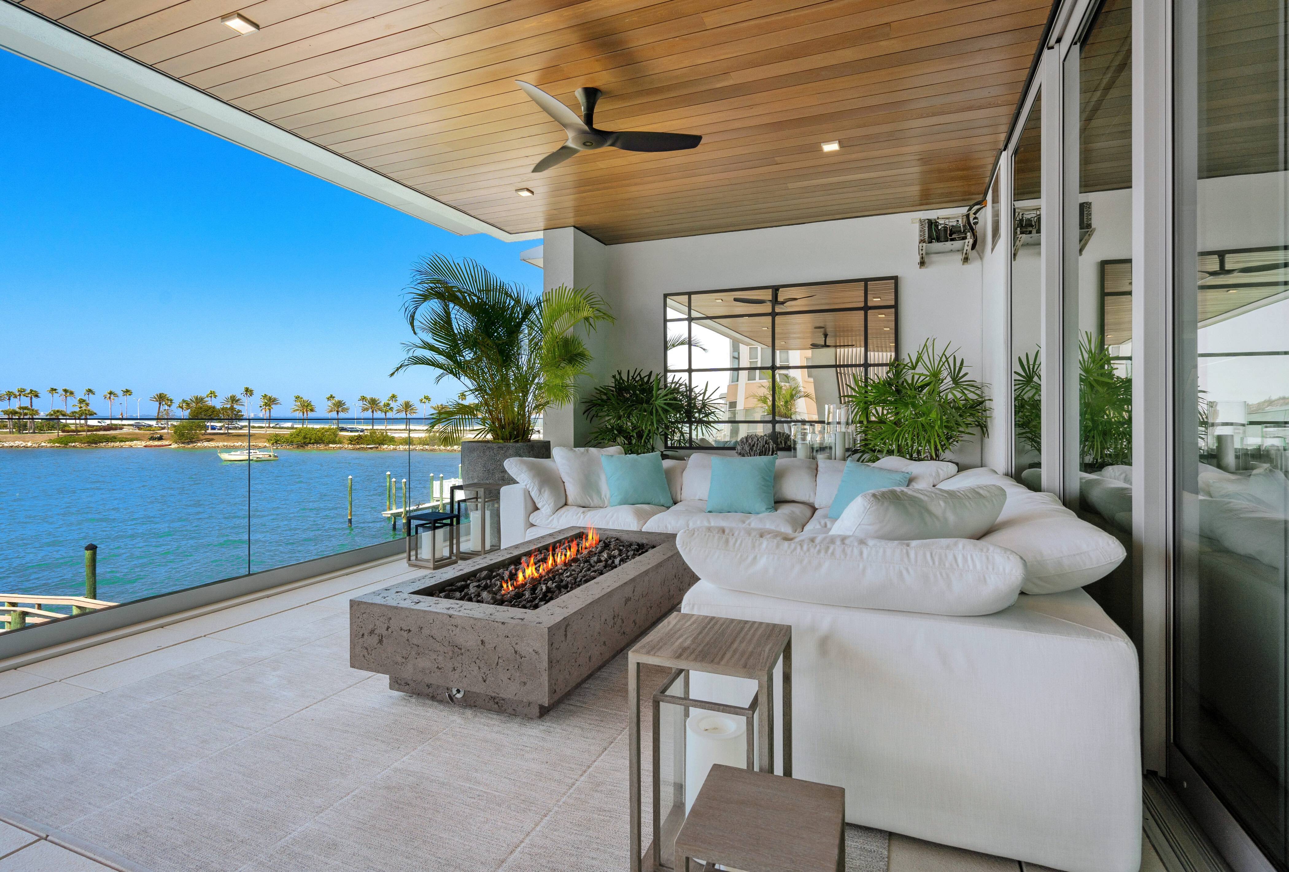 Encompassing over 3,034 square feet of interior living space, the one-of-a-kind condominium is appointed with DuChateau engineered wood flooring, custom Italian cabinetry by Cucine Ricci, a 500-bottle, temperature-controlled wine cellar, and Ben Nettles custom concrete fireplaces. A chef's delight, the gourmet kitchen boasts Caesarstone and marble countertops, Thermador appliances, a 75-plus bottle wine column, a custom-organized walk-in pantry, and a spacious island with seating. The private master suite showcases an incredible spa-like retreat and a peaceful morning terrace. Effortlessly blending the indoor-outdoor living areas, the great room captures vast views of Sarasota Bay leading onto a 575-square-foot terrace complete with natural gas grill and glass railing.