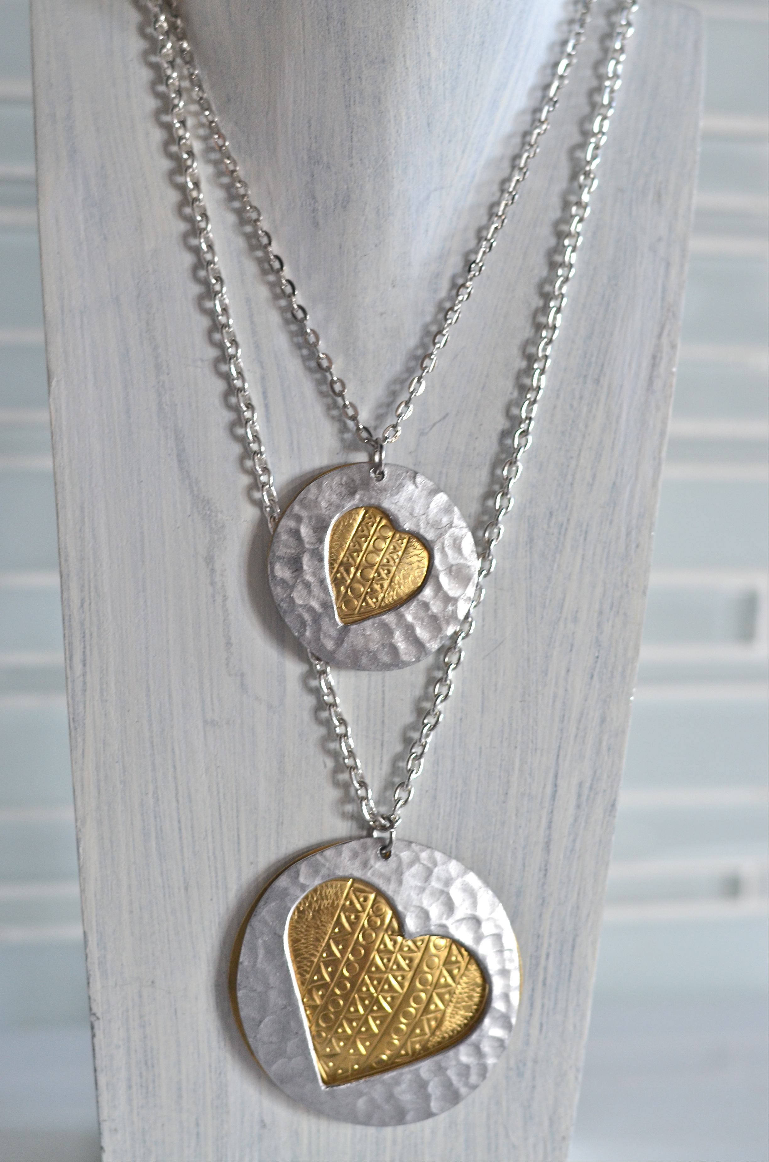 After tweaking the initial designs a bit, Moja and Benson came up with a beautiful heart etched by nail into a brass pendant with an aluminum heart cutout on top. The name for the piece is Two Hearts, One Hope. The two pieces of this fair-trade pendant represent the children of BBBS and the children served by Moja partners in Africa that are united by their hope for a bright future.