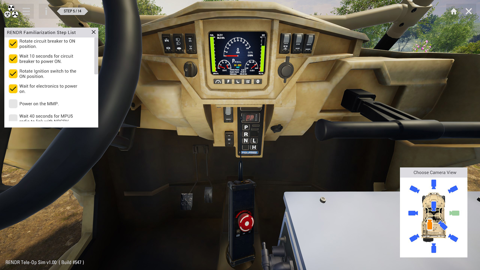 With a mouse, gamepad controller, and video technology on a portable computer tablet, the soldier can learn to drive and operate the reconnaissance vehicle in a variety of simulated scenarios. Training involves state-of-the-art game development tools and techniques, including on-screen instructions to reinforce education to increase familiarity with the equipment and develop muscle memory to improve response time and accuracy; structured tutorials to ensure consistency in training; virtual 3D equipment to duplicate real-world audio cues and realistic environments; and game-design strategies using feedback and rewards to motivate the trainee to achieve the highest possible results.