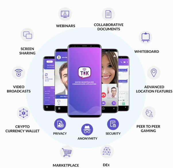 "TOK aims to build a new universe of communication with faster, more secure and private communications enabling people around the world. TOK will be the new age communication application which will enable users with seamless and secure exchange of data not only through Chats - Group and Private and Audio & Video Calls but also empower its users with several added features to help create a communication ecosystem that is not only conducive for personal but also for professional purposes." Text from TheTokApp.com