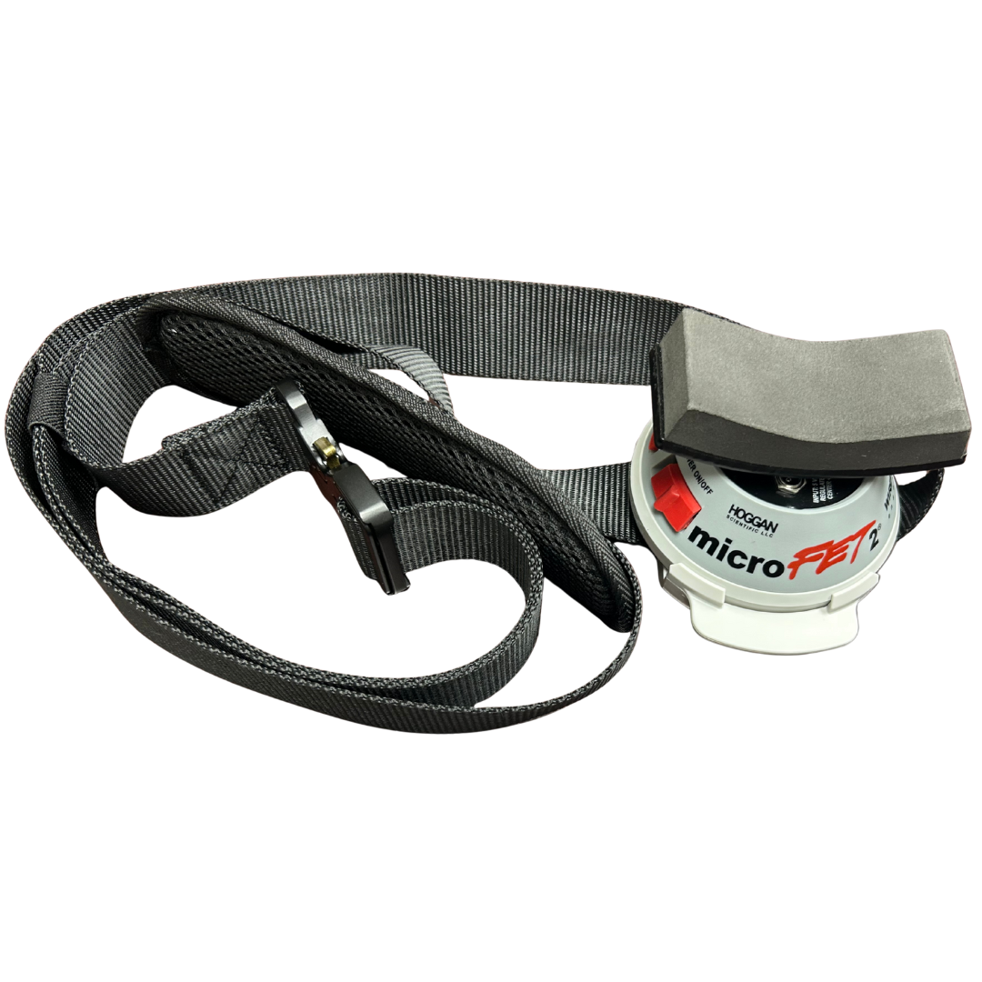 The kit consists of an adjustable strap with a cushioned pad, and test holder that assists in securing the strap to either microFET2 or ergoFET during use. This configuration enables strength testing in a fixed, non-movable, anchored position-particularly beneficial for measuring stronger muscle actions, such as leg extension tests.