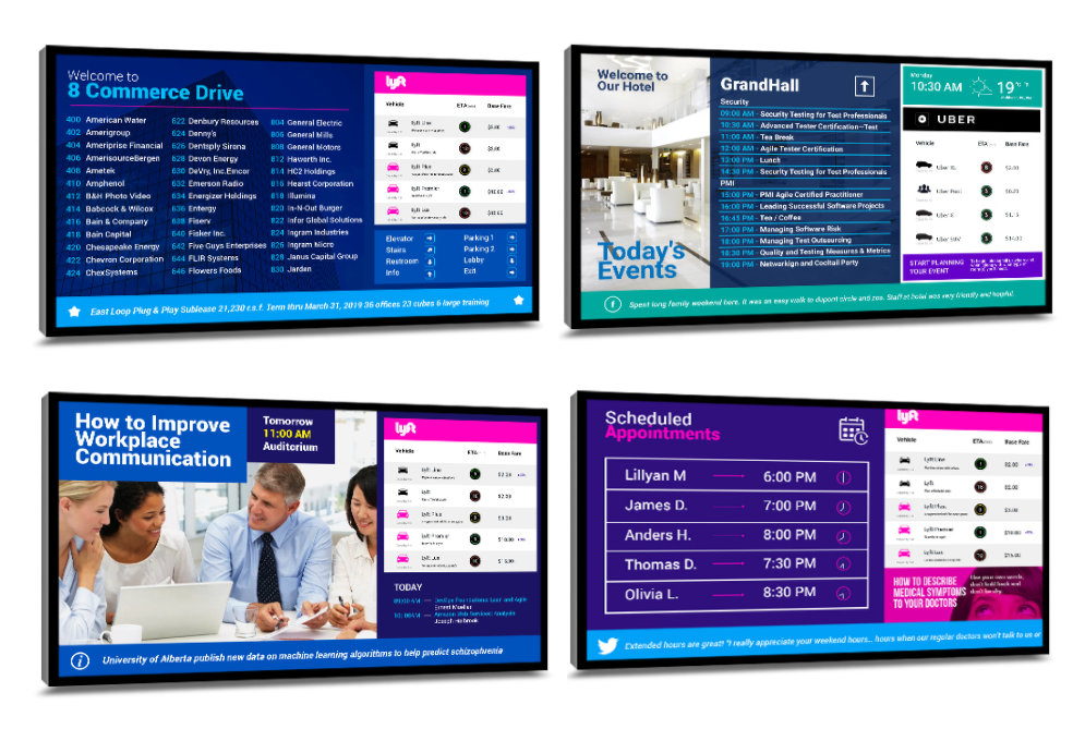 The app expands the Uber and Lyft experience to large digital signs and displays where customers and employees can quickly glance at available options, then hail rides from their phones. This app fulfills the needs of hotels, offices, apartment buildings and transit centers that want to improve the travel experience for their guests.