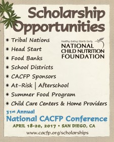 If you work for any of the following organizations operating the CACFP you are eligible to apply for scholarships for each program: CACFP Sponsor, Tribal Nations, Head Start, Food Banks, At-Risk/Afterschool, Summer Food Program, Child Care Centers and Home Providers, and School Districts. The deadline to apply is February 1, 2017. Apply Now!