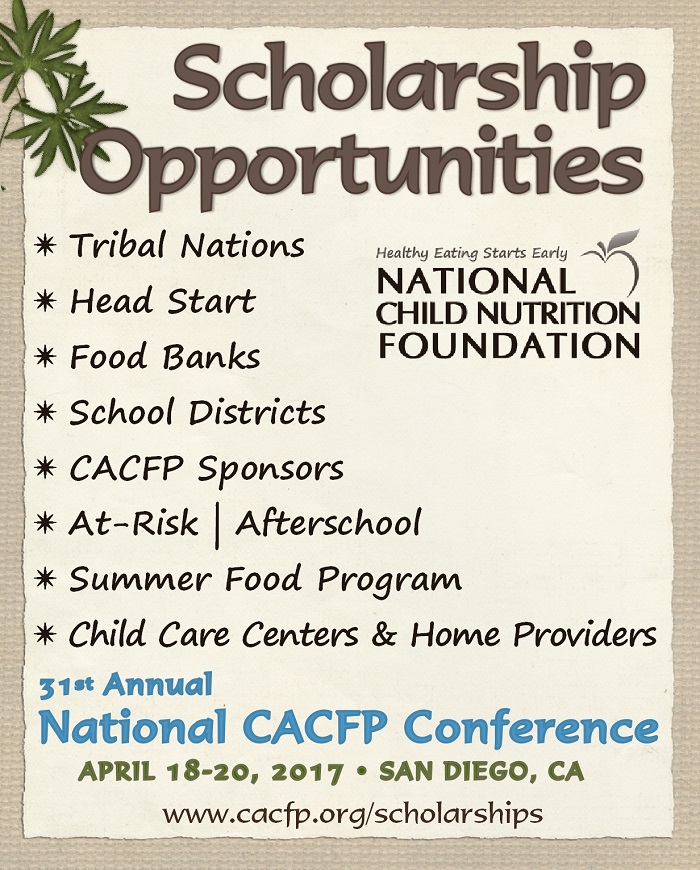 Through the National Child Nutrition Foundation, there are a number of scholarship opportunities available that make attendance possible. Each scholarship will include conference registration, four (4) nights lodging at the conference hotel, and up to $300.00 toward transportation costs.