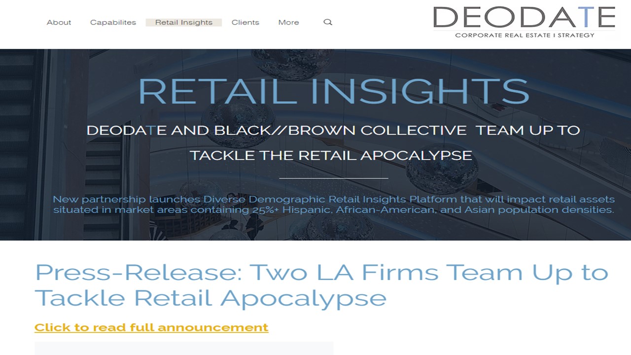LOS ANGELES, March 5, 2020 (Newswire.com) - Today, DEODATE Retail Strategies (DEODATE), in partnership with Black//Brown (B//B), launched a new platform focused on addressing the issues faced by National Retail Tenants and Shopping Mall Owners with assets located in markets with populations consisting of 25% or more Asian, African-American, and/or Latinx demographics. The “Diverse Demographic Retail Insights” (DDRI) platform will marry diverse demographic retail habits by generational age group with retail center programming preferences and tenant mixing.