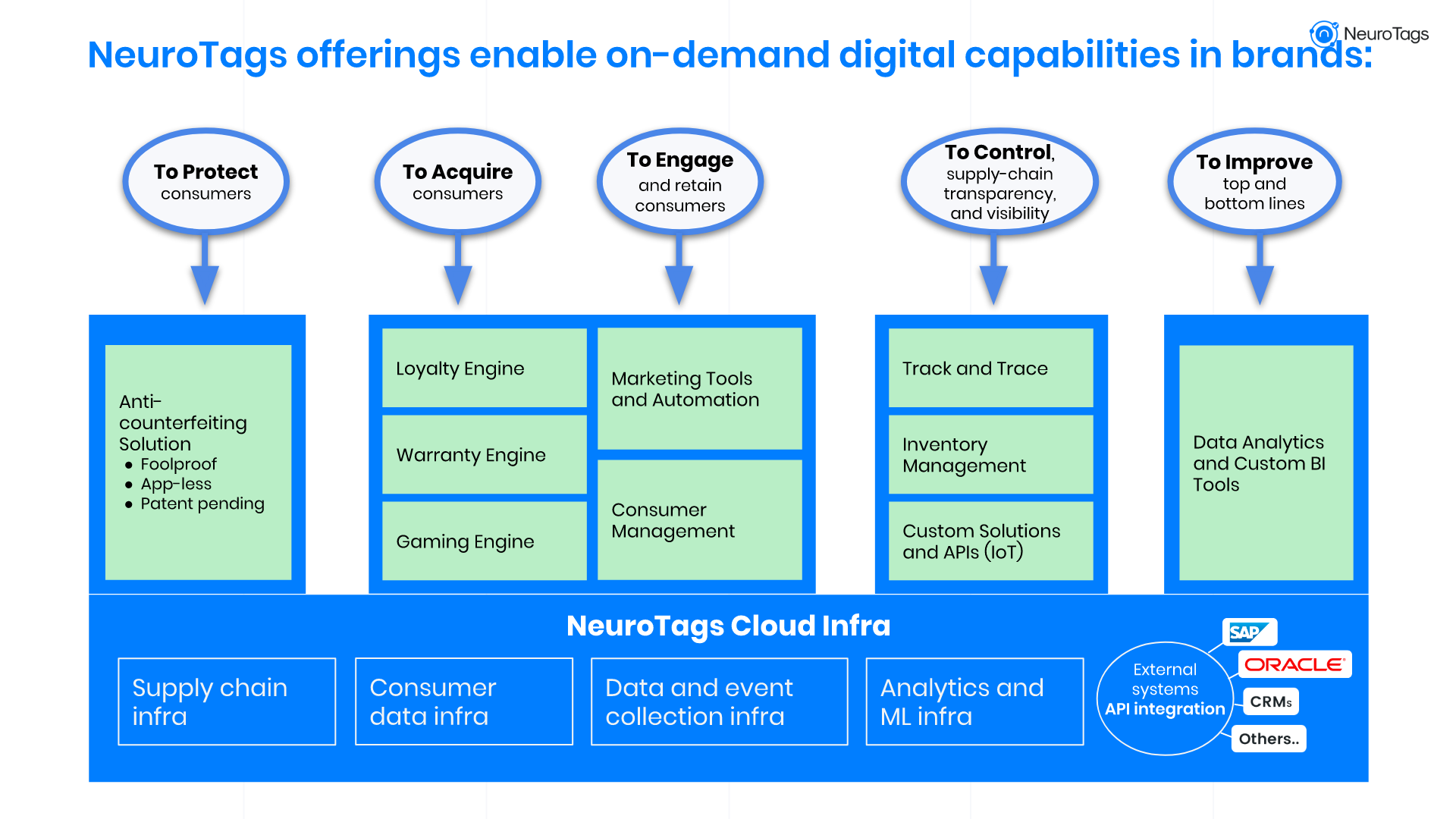 NeuroTags uses algorithmically coupled codes (tags) put directly on manufacturer products. A customer simply scans the code with their smartphone to authenticate a product’s authenticity.