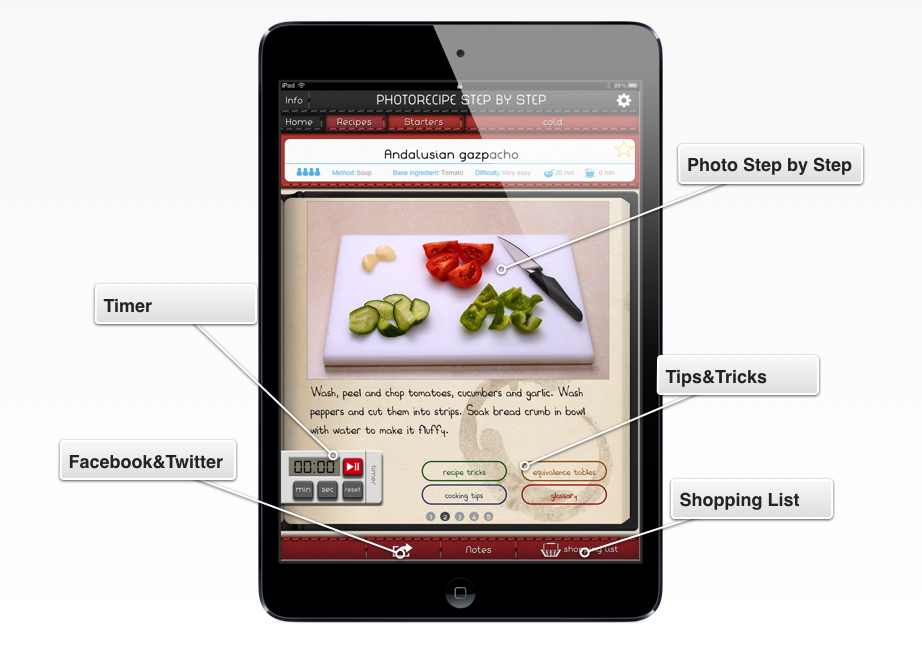 Balance. The designers of this application seem to have found the true meaning of the balanced diet which the Mediterranean offers us, since the careful selection of recipes is a perfect and delicate balance of the most traditional taste with a certain touch of sophistication in the dishes that, without adding complexity in the preparation, manage to bring the point of creativity that will engage beginners and experienced cooks. But could even say that the greatest success of Photo Recipes Step by Step is the versatility of its contents, people who have just begun to learn to cook will be able to obtain dazzling results with easy steps cleverly described and illustrated in each recipe, and the most experts will know how to incorporate to their culinary repertoire recipes with a markedly Mediterranean spirit, a traditional character and a touch of sophistication that surely will leave a good taste in their mouths.